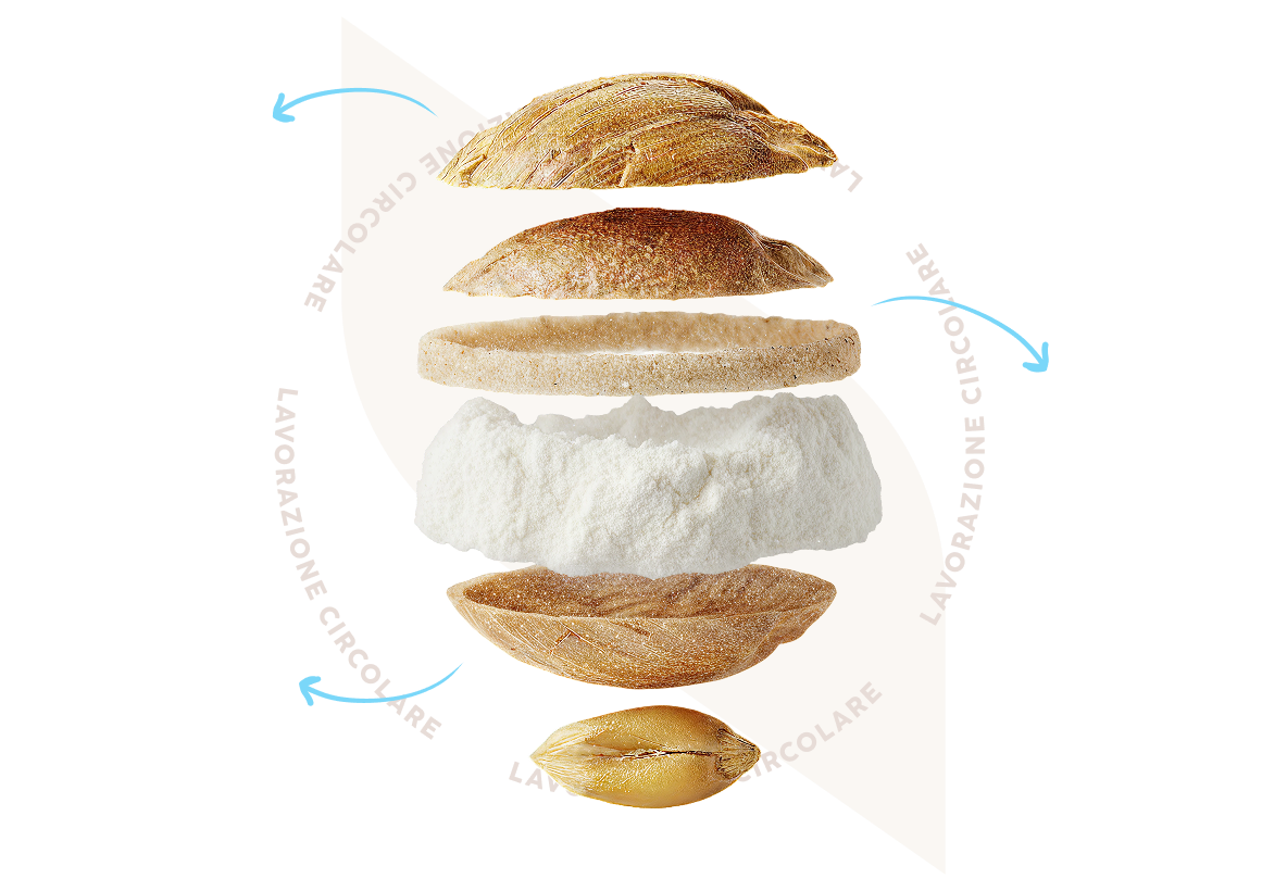 Lavorazione Circolare® è un metodo innovativo di lavorazione del grano, che combina secoli di tradizione con tecnologia all’avanguardia. All’interno dello stesso processo, selezioniamo accuratamente il germe di grano e l’aleurone, il cuore del grano, e ne allontaniamo il suo olio delicato per preservare le fibre e le proteine ricche di nutrienti. Questi elementi preziosi, reincontrando la farina o la semola, danno vita ad Altograno®.